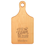Beautifully crafted 13 1/2" x 7" paddle shaped bamboo cutting board with handle. Can be laser engraved for personalization. Add a monogram or name to personalize for a house warming, wedding, or bridal shower! Customize with a logo or other graphics to create the perfect client gift.  The possibilities are many!