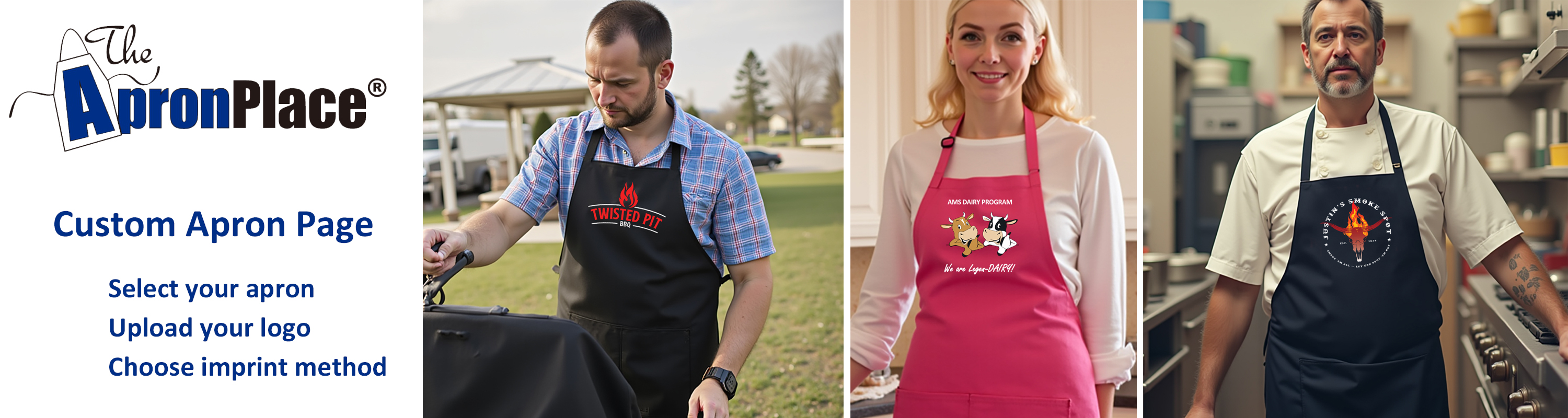 We have been providing personalized and custom aprons through our specialty store (TheApronPlace.com) for over 20 years. We are now using our Perfect Imprinting design tools to help you better design and visualize your project to instantly see pricing and place your order. To get started, select your preferred apron style below and click the "Start Designing" button. The system will walk you through the various imprint methods that we offer (Embroidery, Screen printing and Full Color Prints). If you have any questions about "cleaning up" your logo (like removing backgrounds, changing colors, etc.), we can help with that! Just let us know and we'll be happy to work with you on it.